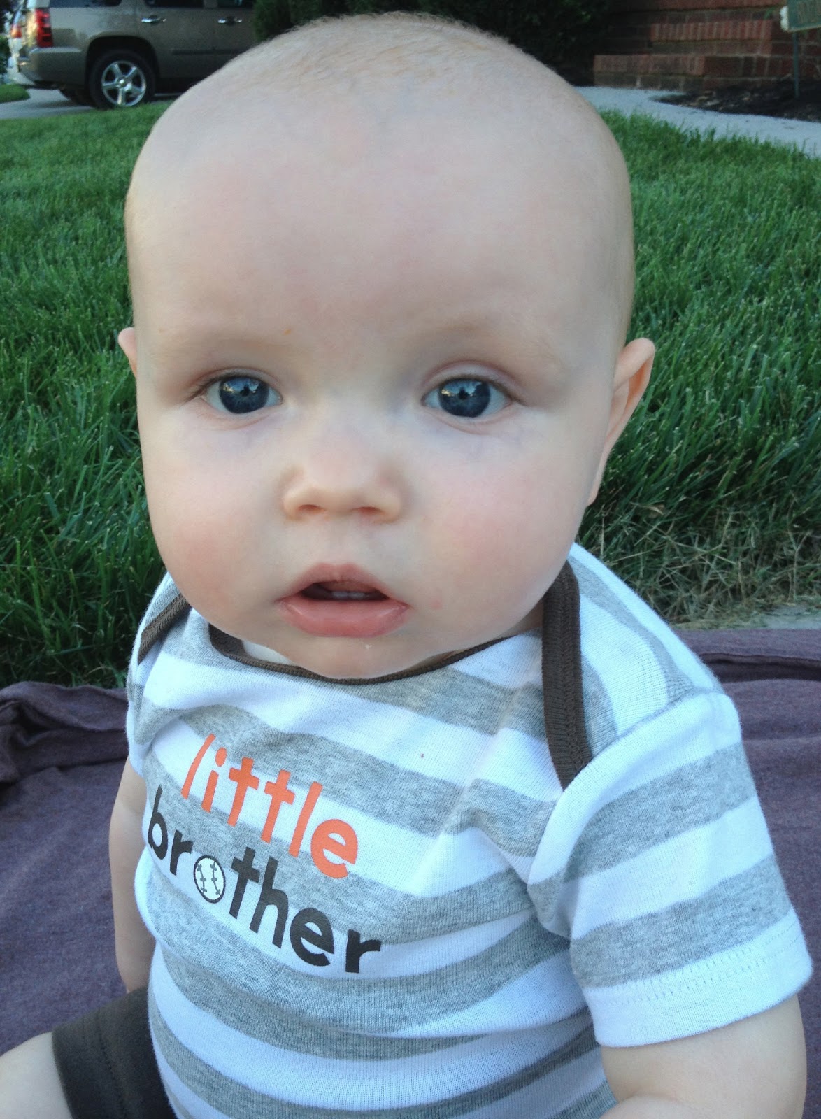 This month, Henry got two more teeth. As it stands right now, he's got his two central incisors and one lateral incisor on the bottom. And he's got two lateral incisors on top. And yes, I did look up dental terminology before writing this post :) One of his central incisors (front teeth) is finally breaking the surface. But for now, we get a hilarious little baby vampire grin: